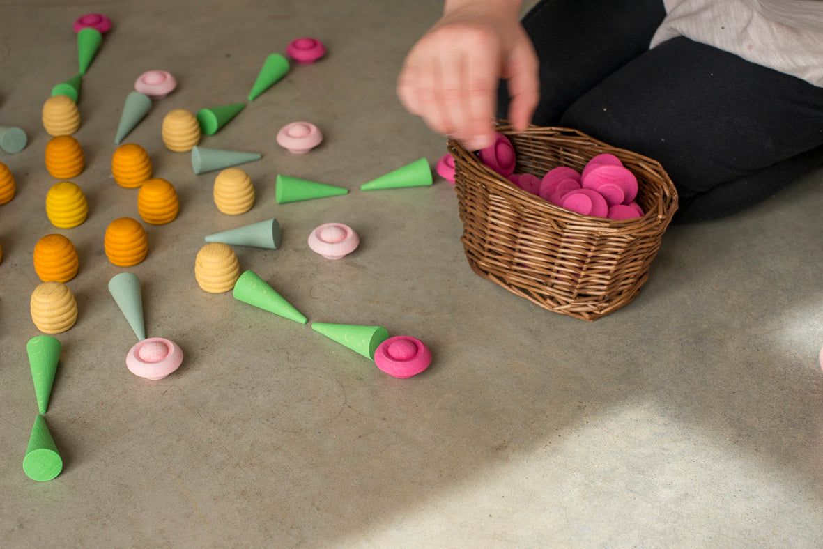 36 cone shaped pieces for creating mandalas and any other open-ended play. Stained in beautiful shades of natural green.