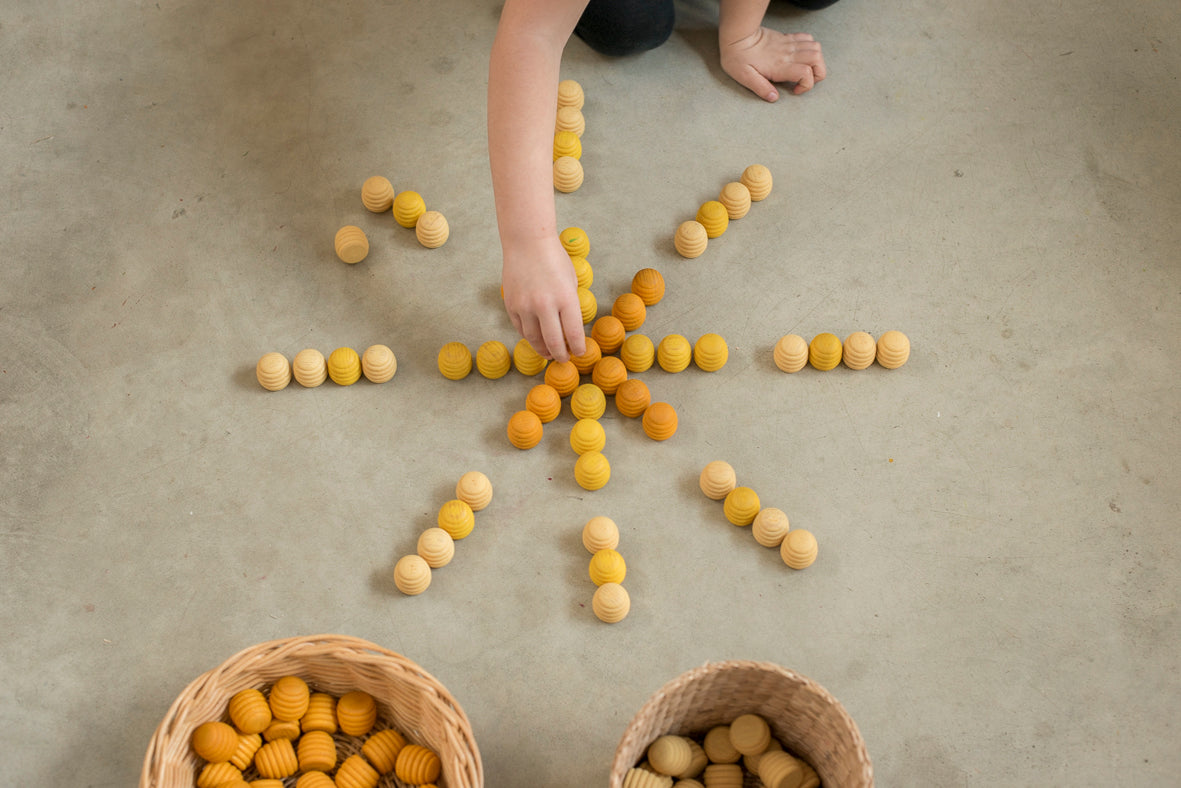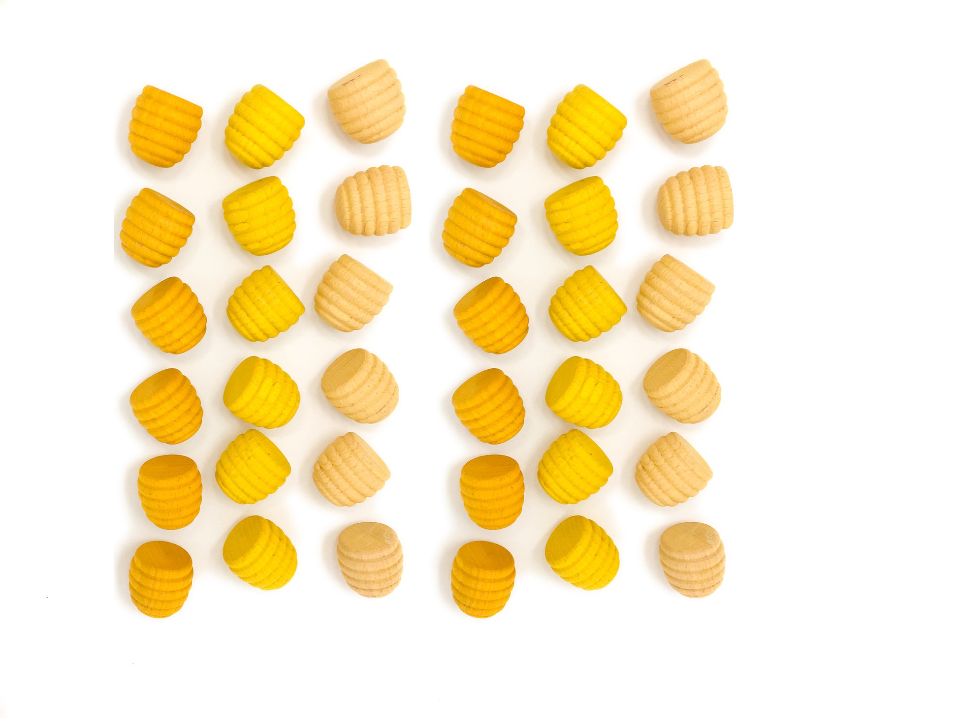 36 honeycomb shaped pieces in natural yellow shades for creating mandalas and any other open-ended play.
