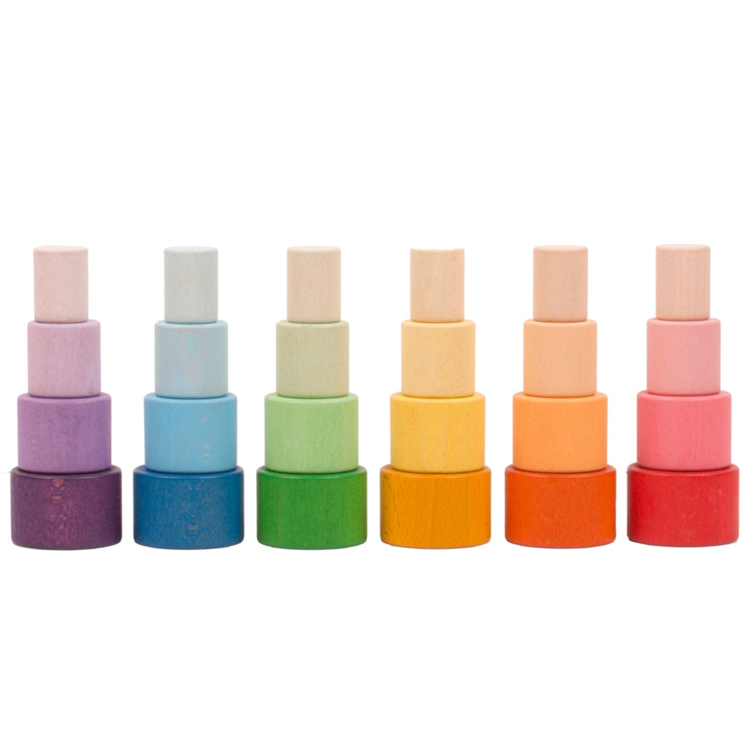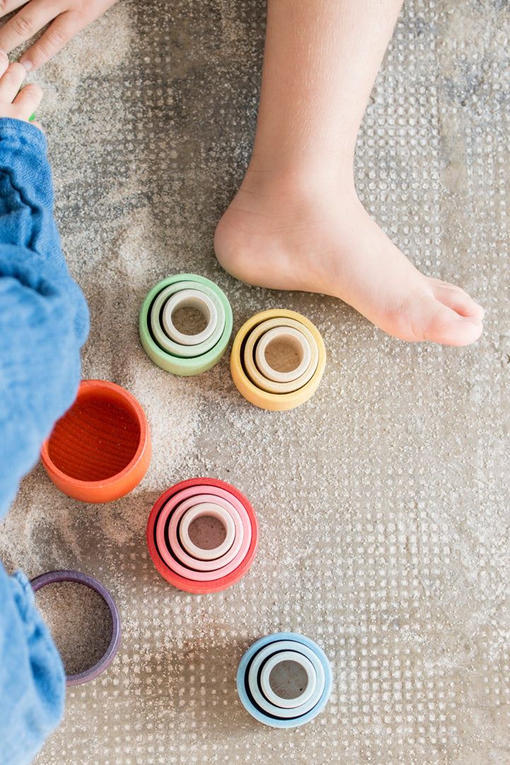 A set of 24 Nest Bowls in a rainbow of colours from Grapat. Handcrafted tactile wooden bowls in beautiful hues of the rainbow which can be used for sorting, stacking and holding treasures or as a wonderful addition to loose parts play.
