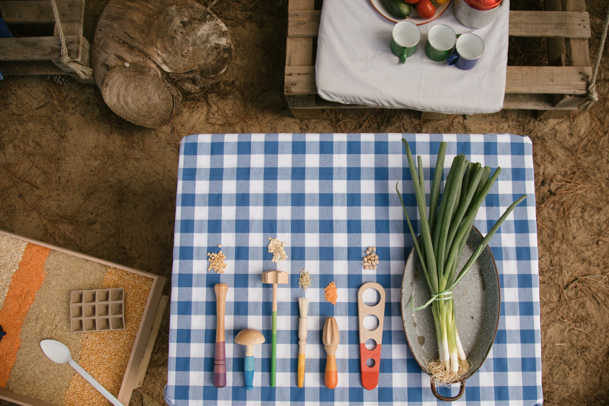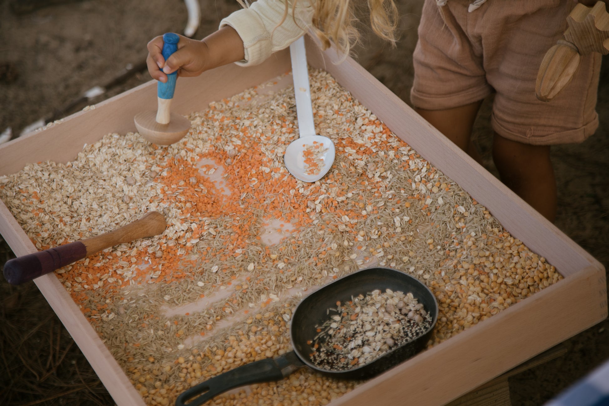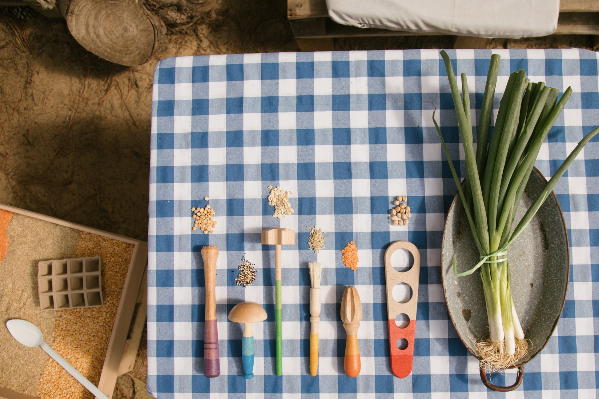 A set of six different tools which can be included in all kinds of play. A whole range of different shapes and sensory textures is included. The tools have been hand-stained in shades of the rainbow.