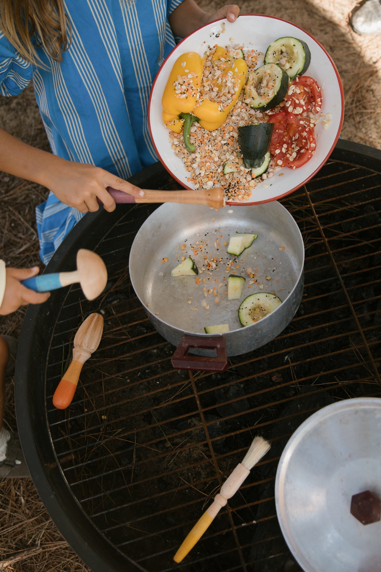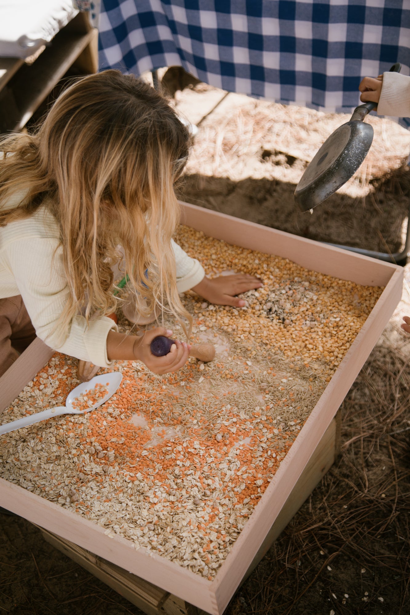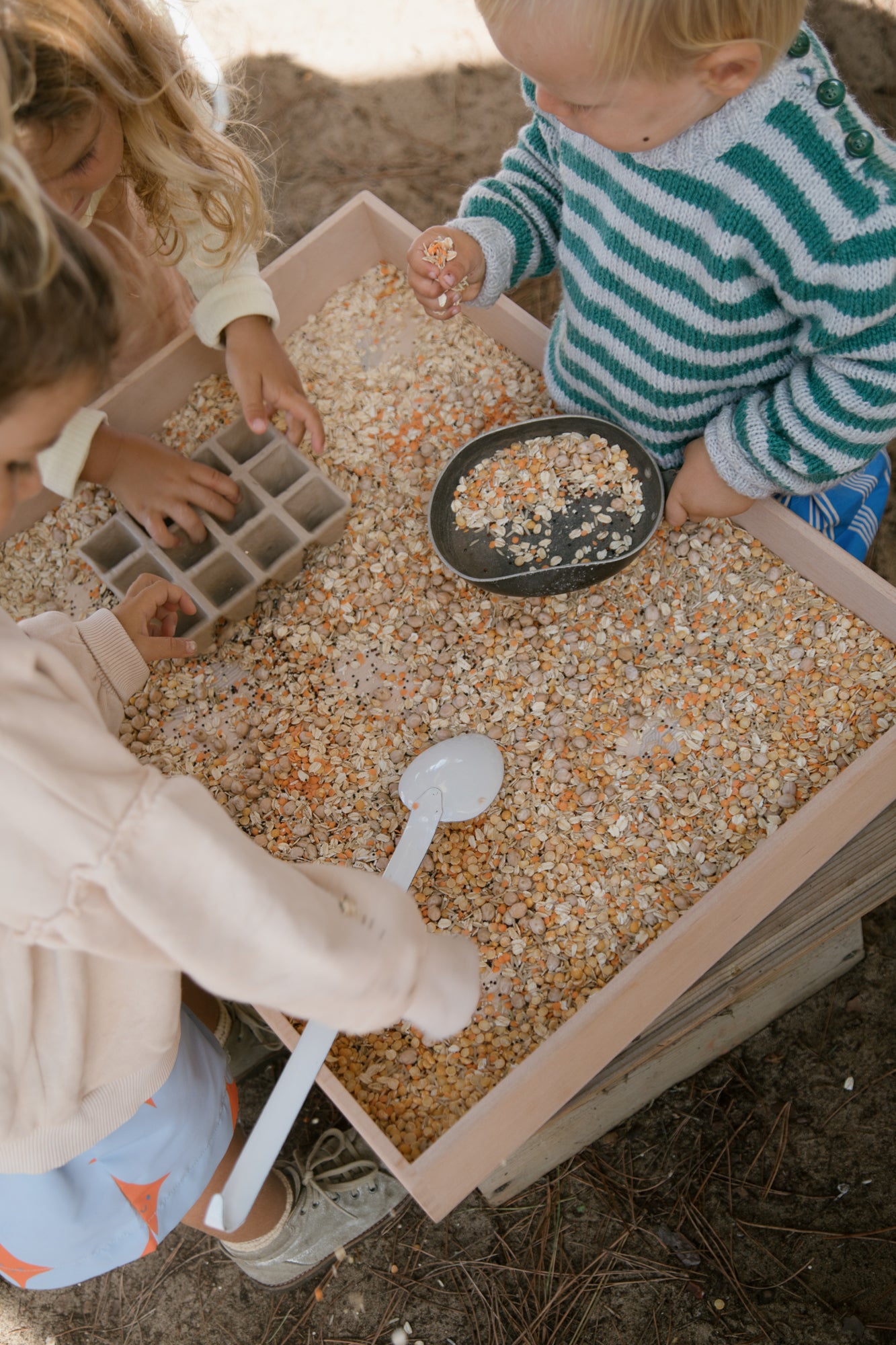A set of six different tools which can be included in all kinds of play. A whole range of different shapes and sensory textures is included. The tools have been hand-stained in shades of the rainbow.