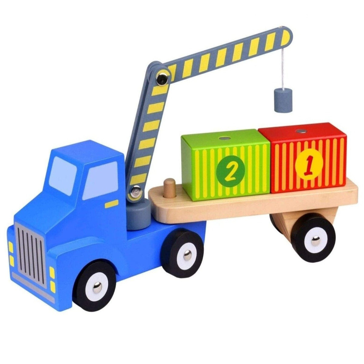 A sturdy Wooden Lorry with a magnetic lifting arm. Use the arm to move the two containers on the back. Great for imaginative play as well as encouraging hand-eye co-ordination and problem solving skills. Made from natural durable wood with child friendly paints.